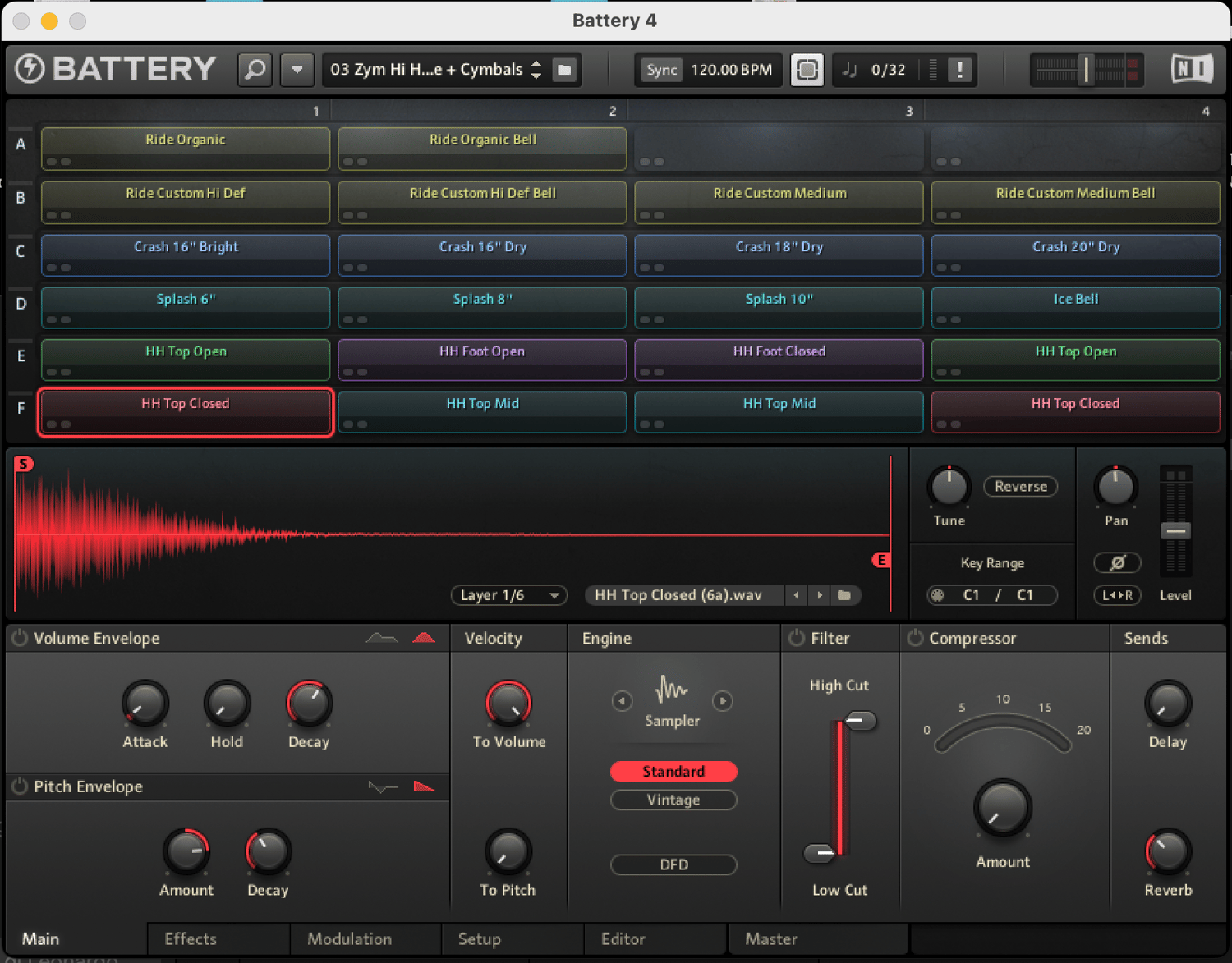 - Hi-Hat Lite + Cymbals Full: mapped in Macro.